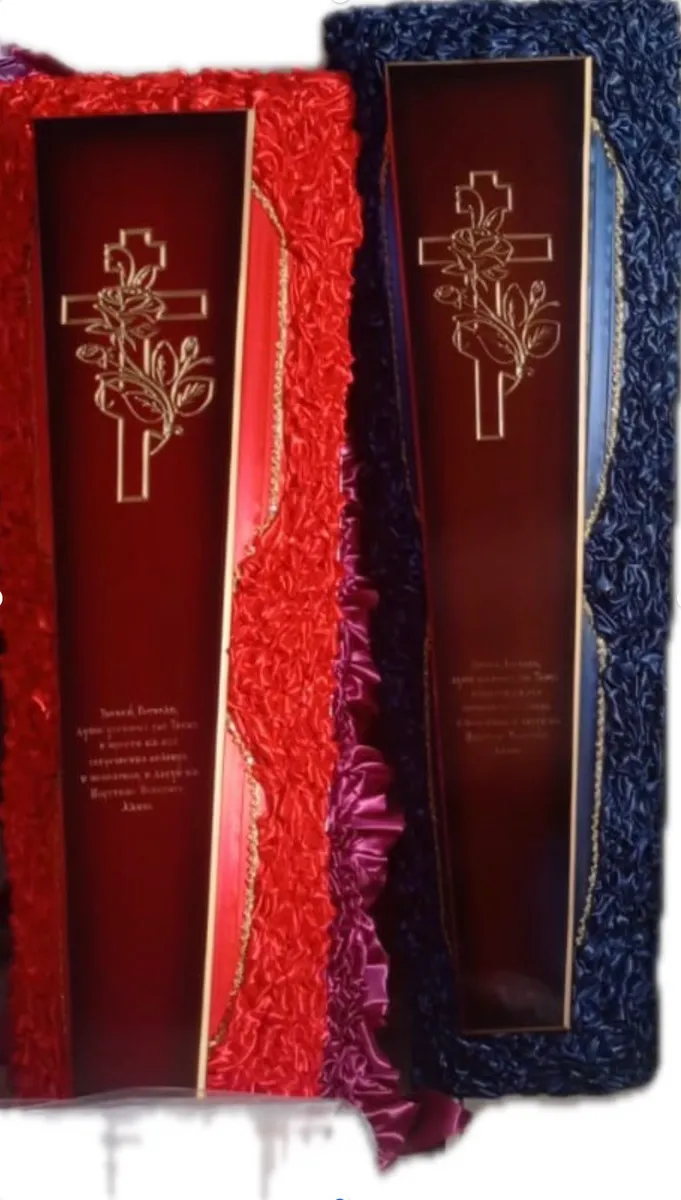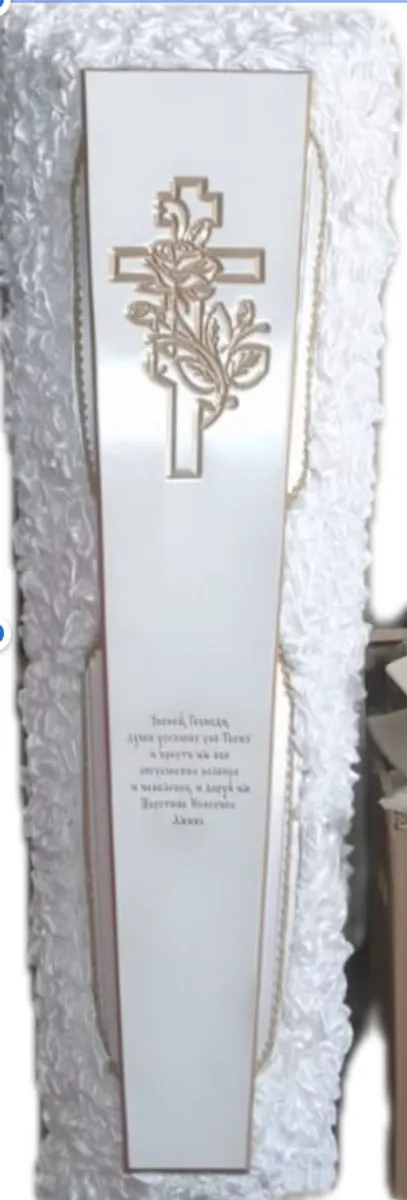 Гроб деревянный в ассортименте. Обивка атласной тканью с декоративным элементом из дерева, с молитвой на крышке гроба. Внутри обивка атласной тканью. По краю изделие декорировано кружевом с золотыми нитями.