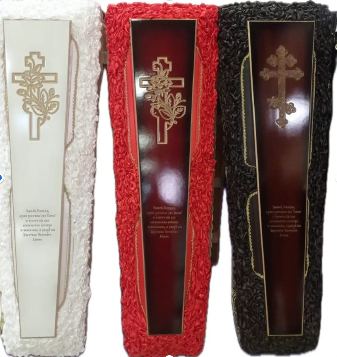 Гробы различных размеров и цветовой гаммы, подходят как невысоким людям, так и выше среднего.